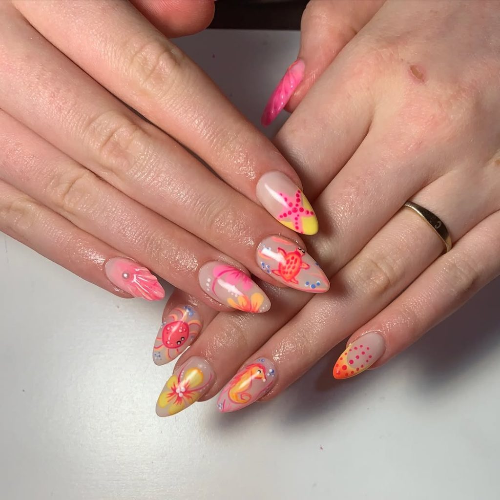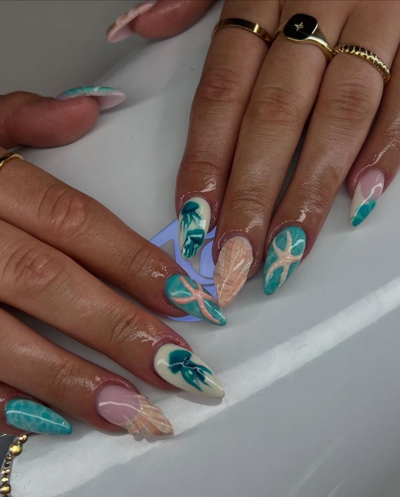 18. Tropical Spring Break Nails with Starfish and Ocean Motifs