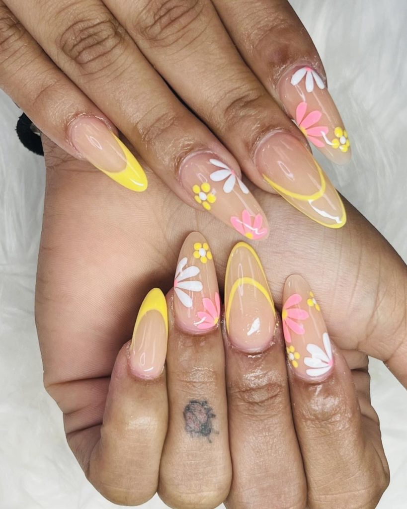23. Yellow Floral Spring Break French Tips with Soft Details
