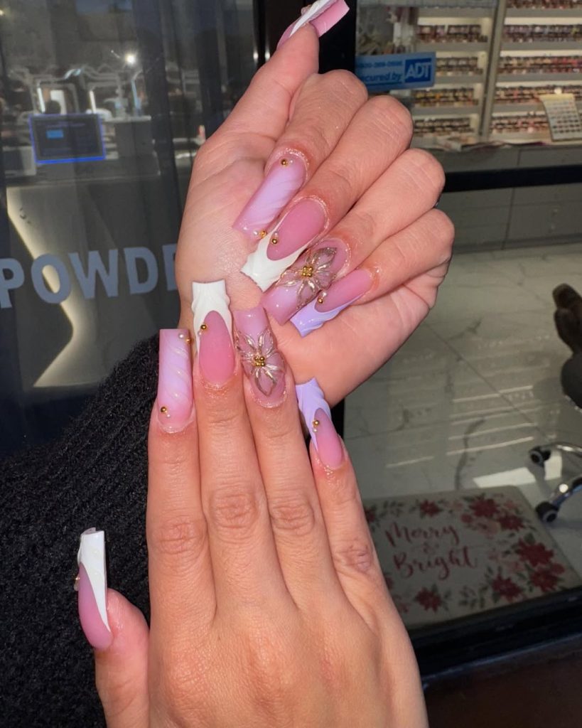 13. Lavender Floral Spring Break’s French Tips