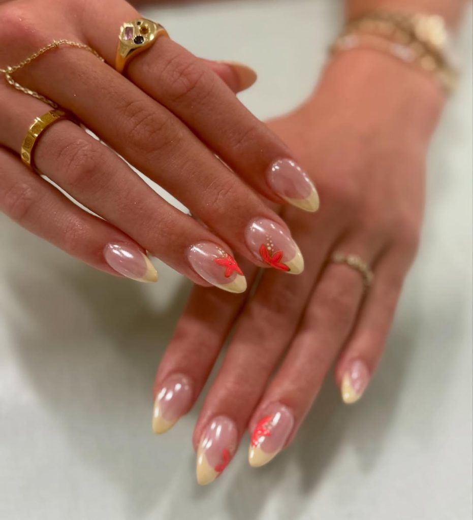 These nails feel calm, refined, and quietly charming. The sheer nude base keeps everything soft and natural, while the tiny red floral accents add just the right touch of color and personality. It’s a design that feels effortless and timeless, perfect for spring break if you prefer understated beauty.