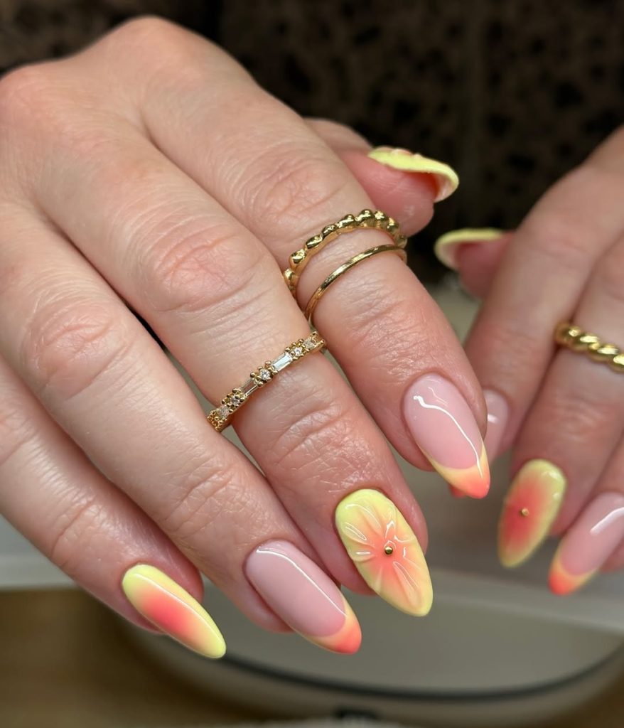 15. Modern Ombre Spring Break Nails in Warm Sunset Tones