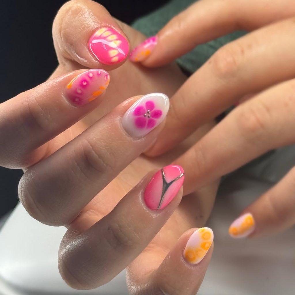 This one just feels like pure spring break joy encapsulated in a nail set. The combination of vivid pink shades, soft milky bases, and delicate floral details makes a look feel spontaneous and cheery—as if you were doodling flowers during an idle afternoon.” There’s a slightly different narrative to each nail, which makes the entire set feel as light and playful as all get out.
