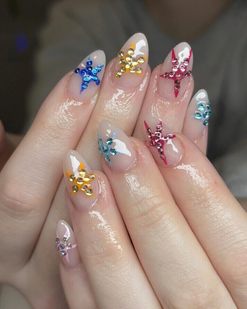 8. Starfish-Inspired Spring Break Nails with Rhinestone Details