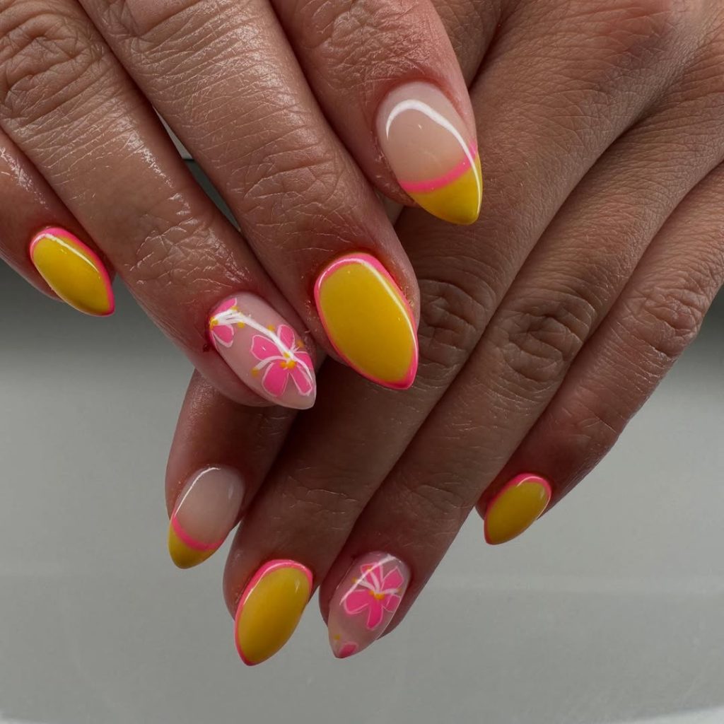 9. Bright Yellow and Pink Spring Break French Tips