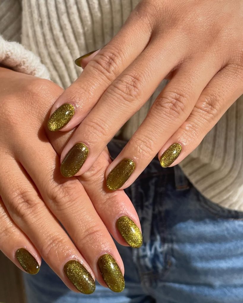1. Olive Glow Cat Eye Almond Nails