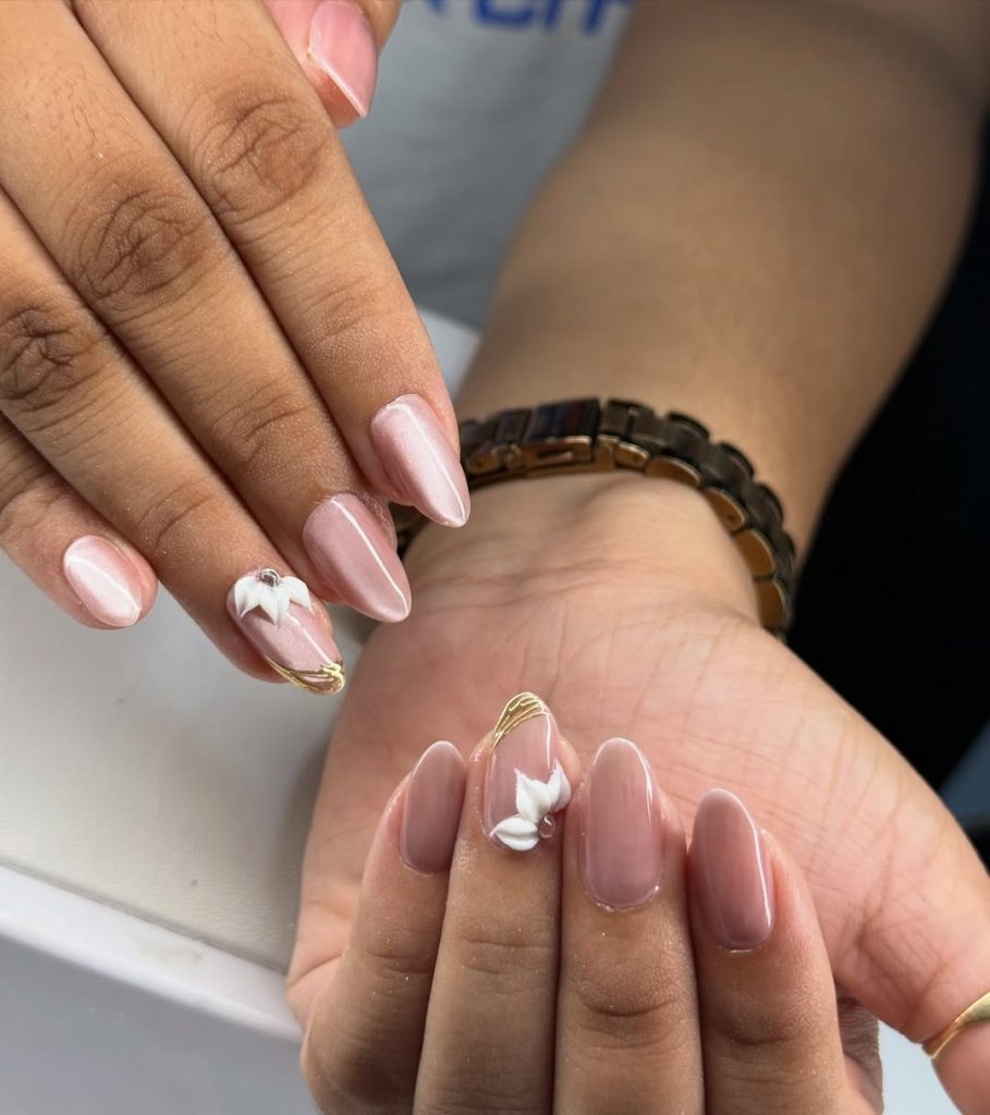 This manicure feels soft, romantic, and quietly luxurious. The nude cat-eye base glows subtly, while the white floral accents add a gentle, feminine touch. It’s the kind of look that feels natural but intentional, perfect for women who appreciate beauty in the details.