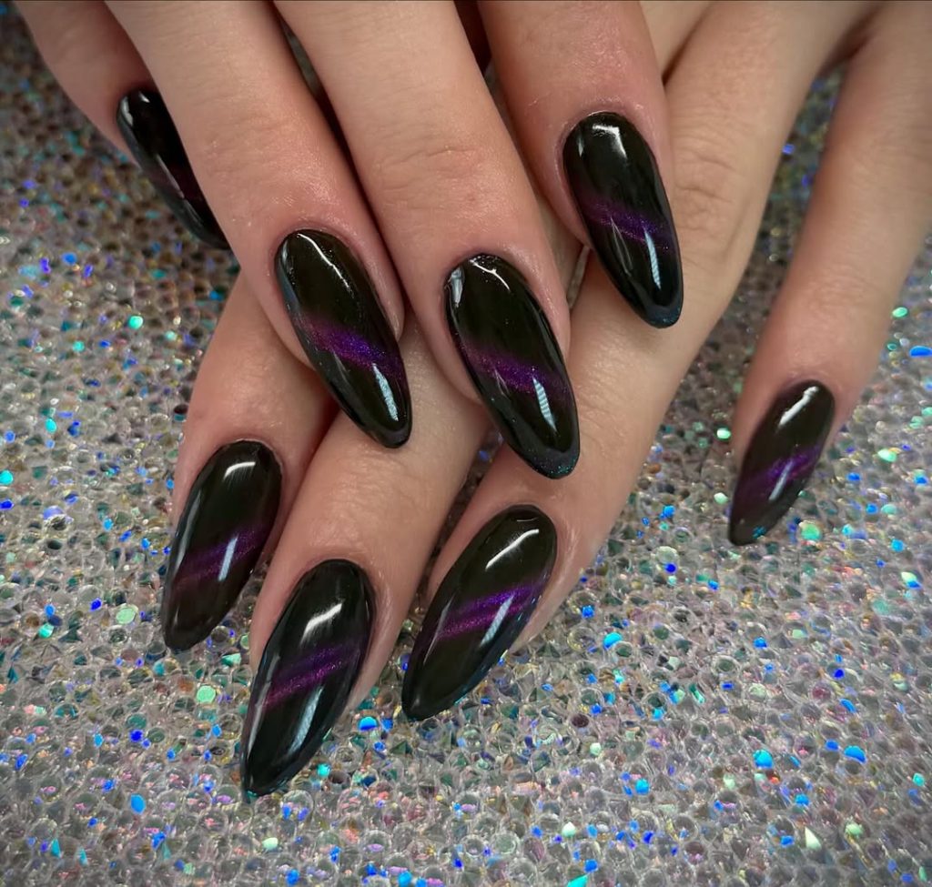 These nails feel mysterious and powerful, almost like wearing confidence on your fingertips. The dark base paired with a subtle purple cat-eye line creates a dramatic contrast that catches the eye without screaming for attention. It’s sleek, modern, and undeniably cool—perfect for women who embrace their bold side.