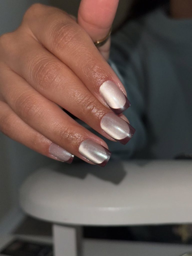 This manicure feels clean, modern, and quietly glamorous. The soft silver cat-eye finish paired with a subtle French edge gives the nails a fresh, polished look without being overdone. It’s elegant in a way that feels effortless, perfect for women who appreciate refined simplicity.