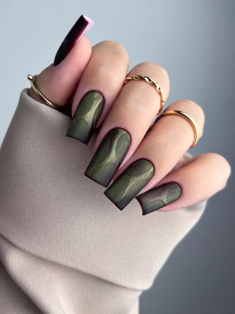 These olive-toned cat-eye nails feel modern, confident, and fashion-forward. The muted green shade paired with the magnetic shimmer gives the manicure a subtle glow that feels chic rather than trendy. It’s the kind of look that quietly signals great taste without trying too hard.