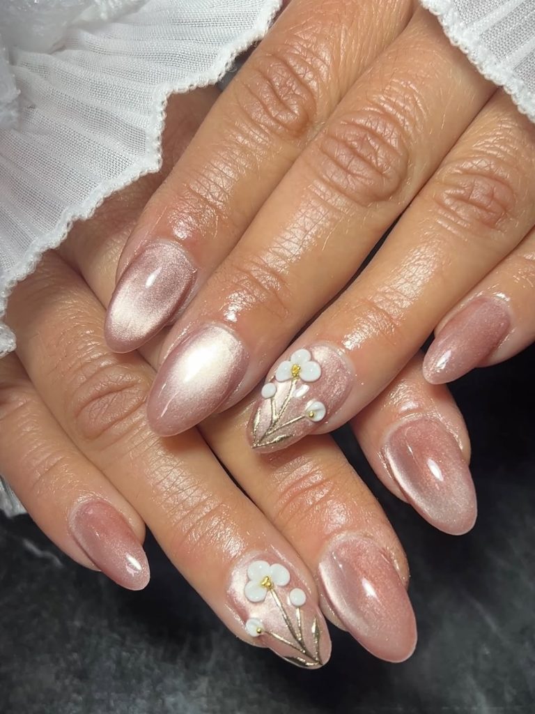 These nails feel delicate, feminine, and quietly romantic. The pearl-like cat-eye shimmer gives the surface a soft glow, while the tiny white floral details add a gentle spring touch. It’s the kind of manicure that feels light and graceful, perfect for moments when you want your hands to look polished but not overdone.