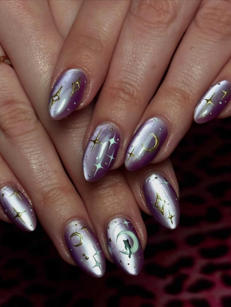 18. Lavender Cat Eye Nails with Celestial Art