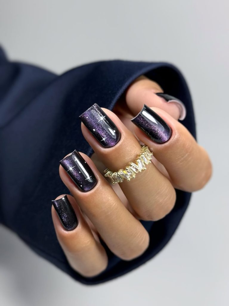 Square nails give this design structure and strength, making it ideal for women who love clean lines and darker colors. This is a wonderful option if you’re drawn to simple but striking designs that feel current yet timeless. Black cat-eye nails continue to be a strong trend from 2025 into 2026, especially for women who love a modern edge.