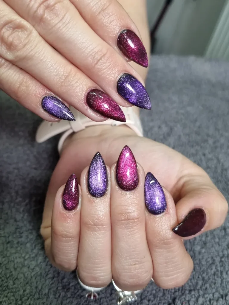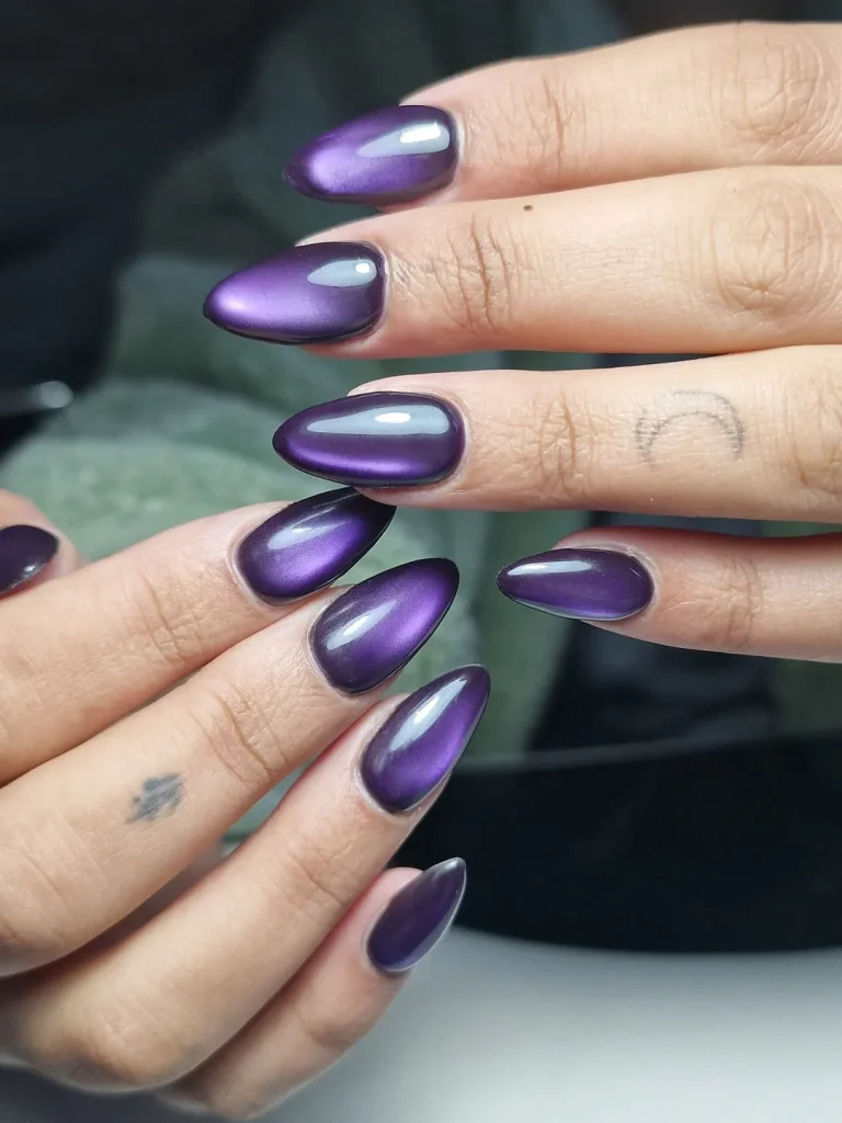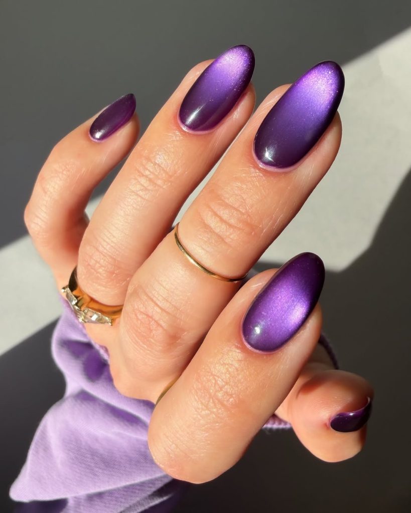 21. Deep Violet Cat Eye Almond Nails