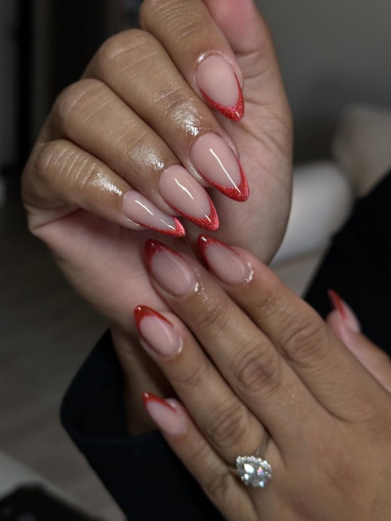There’s something instantly captivating about this red French tip interpretation. The soft nude base keeps the look refined, while the shimmering red tips add confidence and allure. It feels feminine, polished, and just a little bit daring—like classic style with a modern wink.
