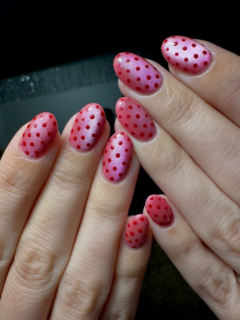 These nails feel playful, cheerful, and wonderfully lighthearted. The soft pink cat-eye base gives a gentle glow, while the tiny polka dots add charm and personality. It’s the kind of manicure that makes you smile every time you catch a glimpse of your hands.