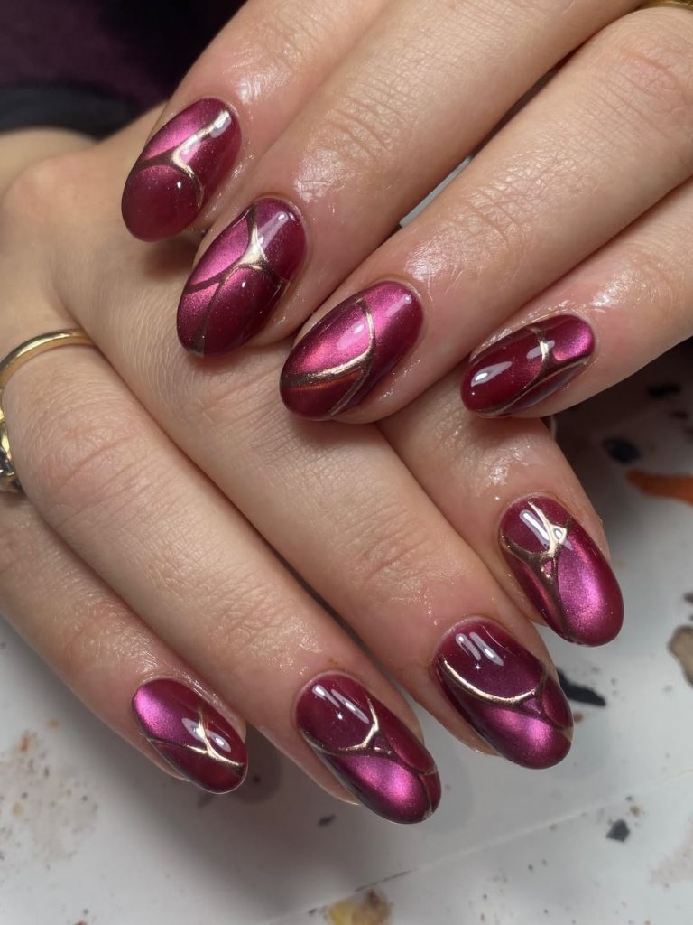 24. Magenta Cat Eye Nails with Metallic Lines