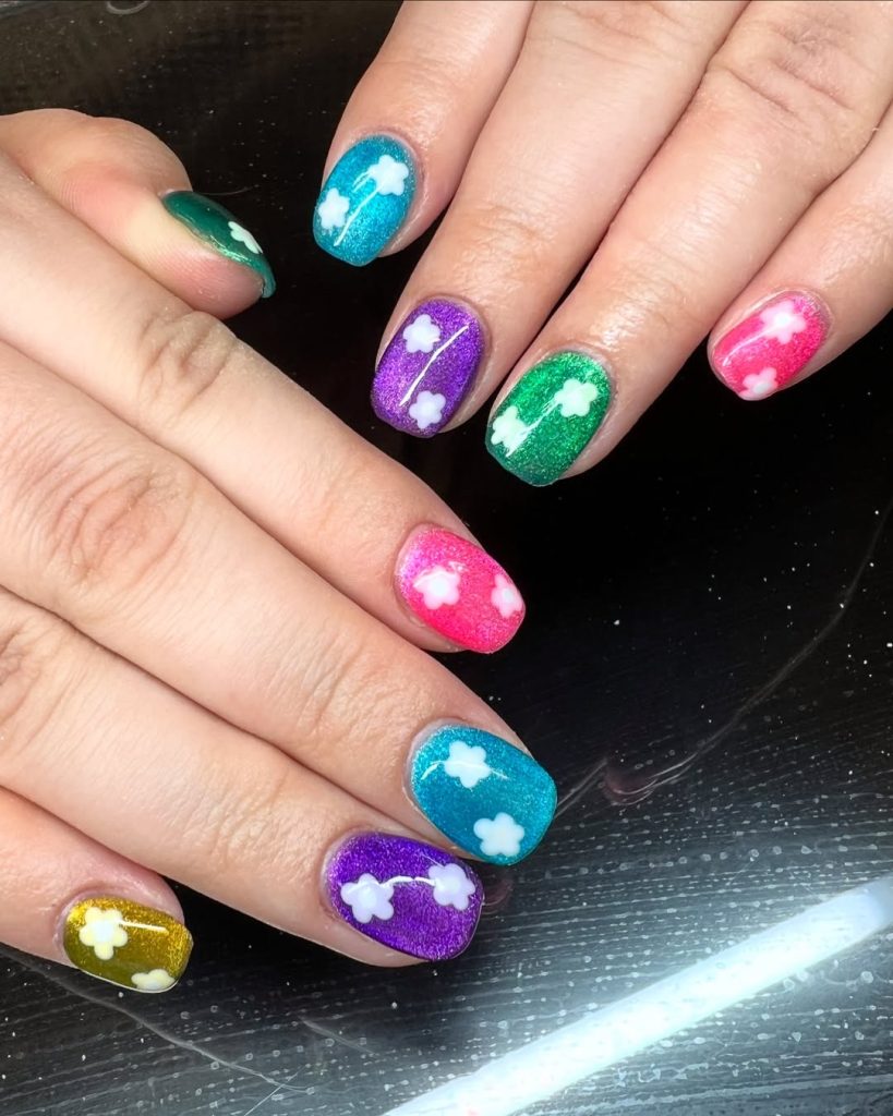 This look is ideal for short or square nails if you love bold designs but still want something wearable. Mixing purple, green, blue, and pink keeps it intriguing, while the cat-eye shimmer ties everything together. It’s a wonderful Inspo option if you want ideas that stand out and celebrate personality. Best for those who enjoy experimenting and don’t mind their nails being a conversation starter.