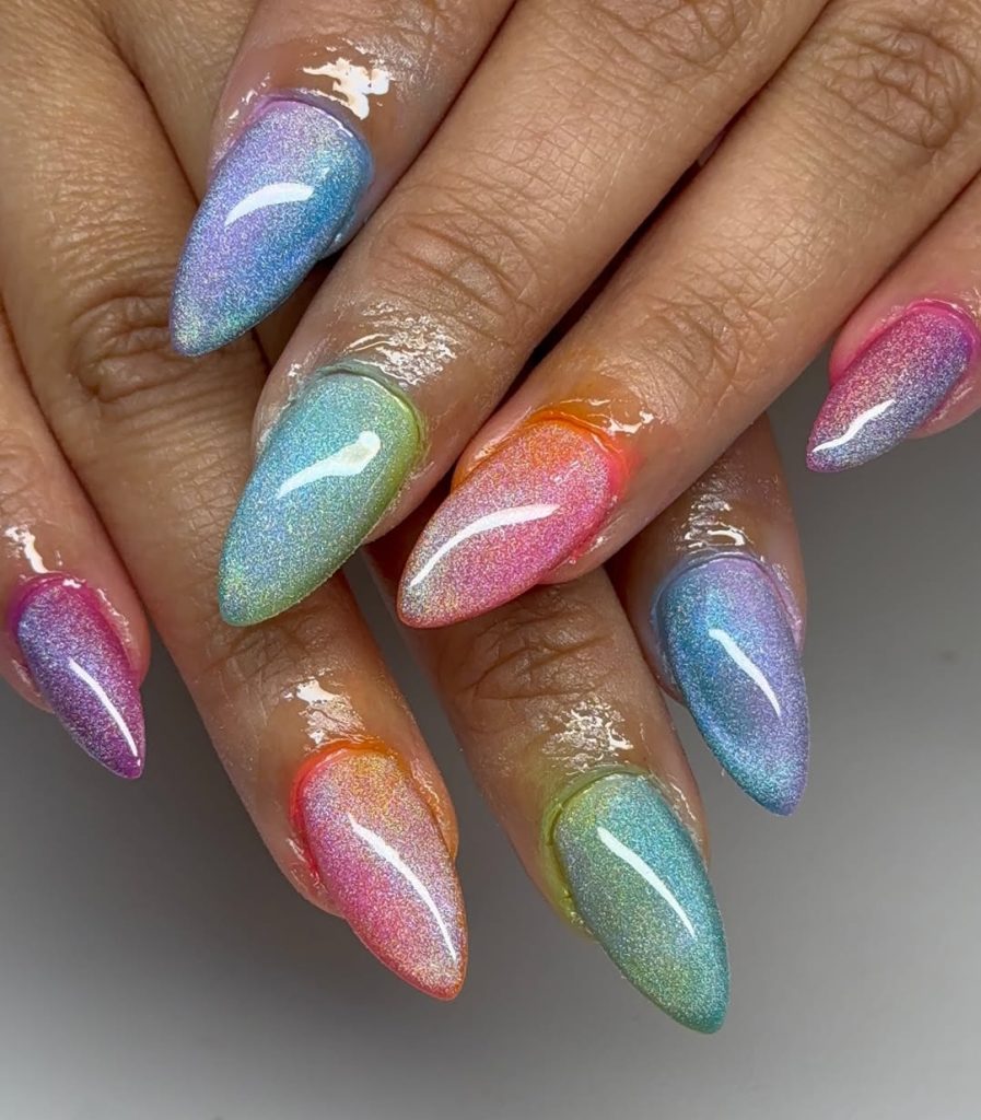 5. Pastel Rainbow Cat Eye Almond Nails