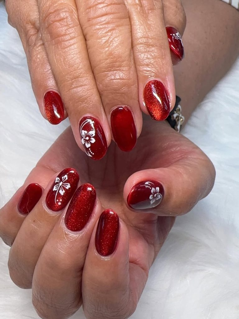 This manicure proves that red never goes out of style. The glowing cat-eye effect adds dimension to the classic shade, while the subtle flower accents soften the look and make it feel more personal. It’s bold, elegant, and full of warmth—the kind of nails that make you feel instantly put together.
