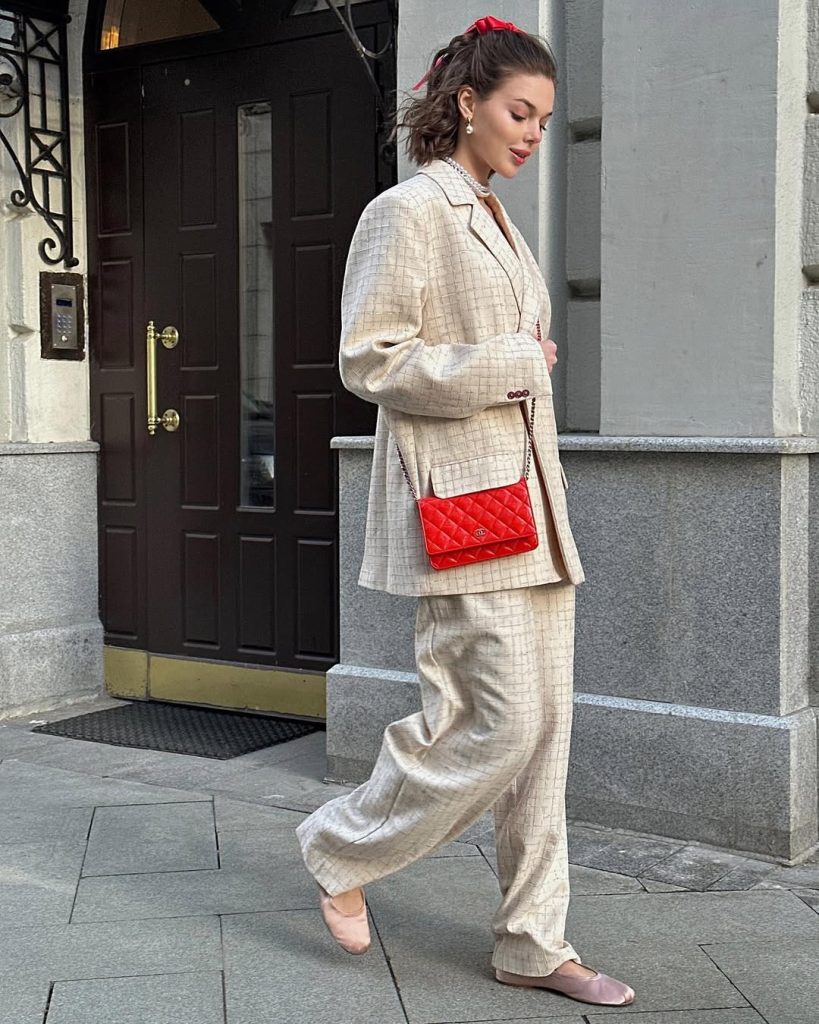 This look thrives in early spring when mornings still feel cold but afternoons invite movement. The suit works beautifully for creative offices, gallery openings, or city walks in Europe—especially Paris or London. To add personality, play with lipstick or a silk scarf. Avoid heavy footwear or oversized totes, which can disrupt the suit’s refined flow.