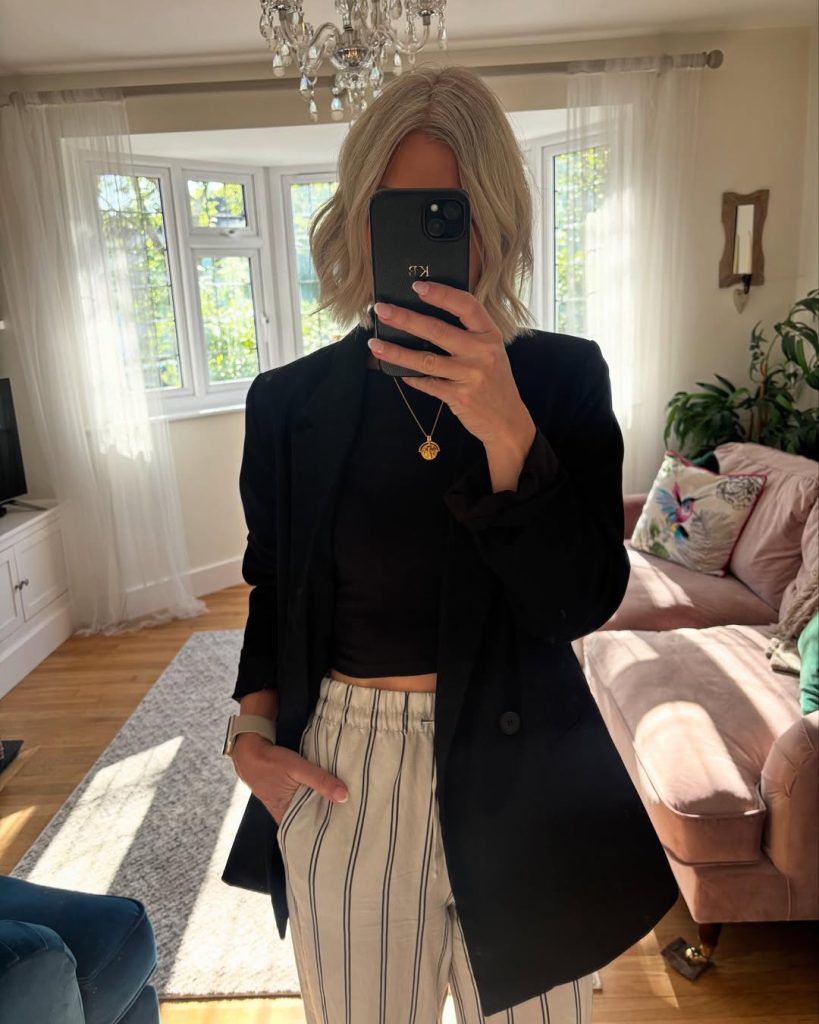 Perfect for office days, travel, or city walks in London or Paris, this outfit feels bright and composed. Add personality with a pastel manicure or delicate jewelry. Avoid oversized layers—sharp lines are key to maintaining its elegance.
