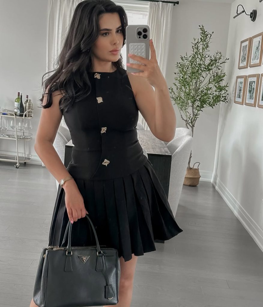 A tailored black dress with pleated movement delivers vintage classy charm with a polished, modern finish.