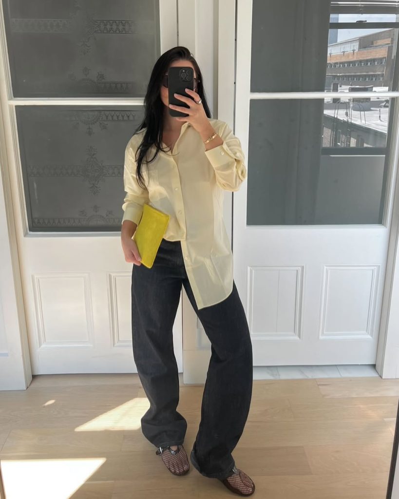 A bright yet grounded outfit pairs a soft yellow shirt with dark trousers, creating a fresh spring contrast.