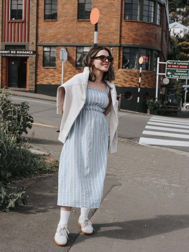 A striped midi dress paired with relaxed layers delivers a casual, cool spring look with understated style.