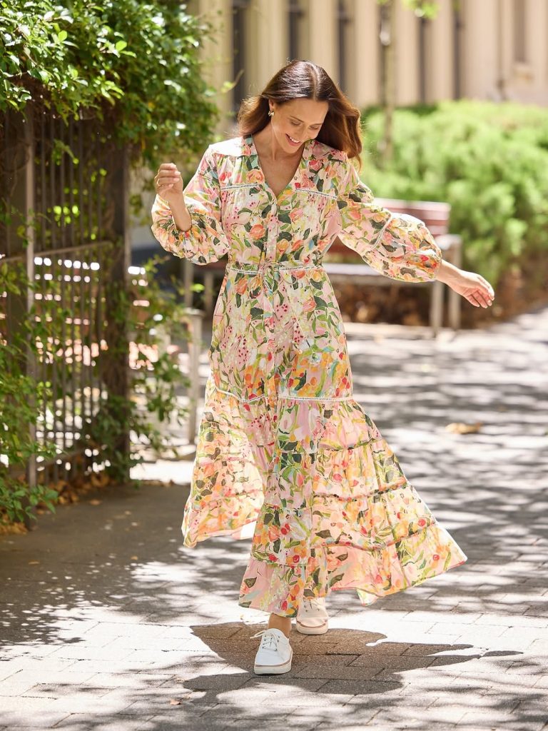 A flowing floral dress brings soft, joyful energy to spring styling with light movement and romantic detail.