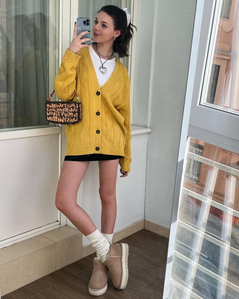 A delightfully, casual outfit that blends warmth and youth, pairing cozy textures with a hint of 90s charm and modern street style.