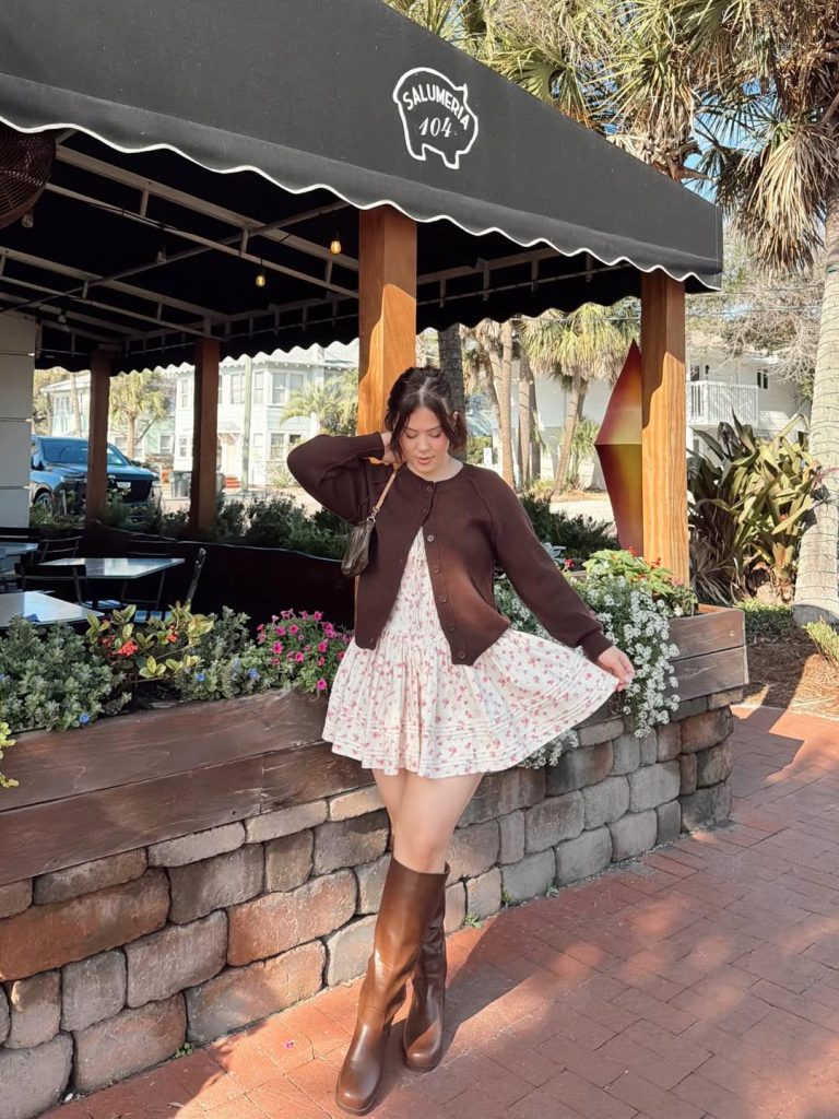 This outfit feels right for casual lunches, weekend walks, or small-town outings. The mix of florals and knits creates a welcoming, relaxed vibe. Add simple jewelry for balance and avoid heavy outerwear that hides the dress’s shape.