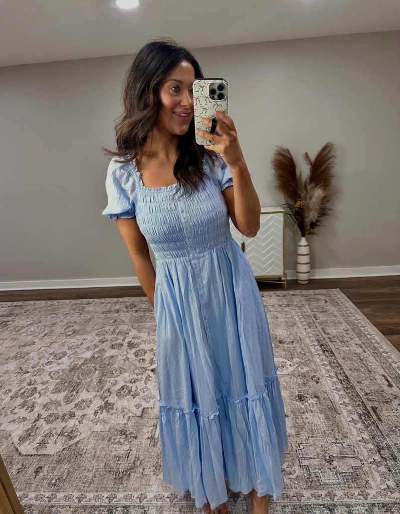 A light blue dress brings gentle romance to everyday style, combining comfort with timeless femininity.