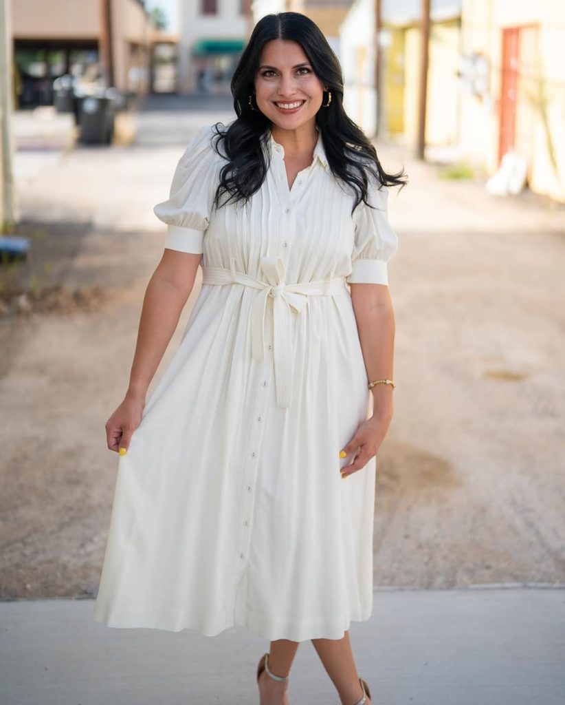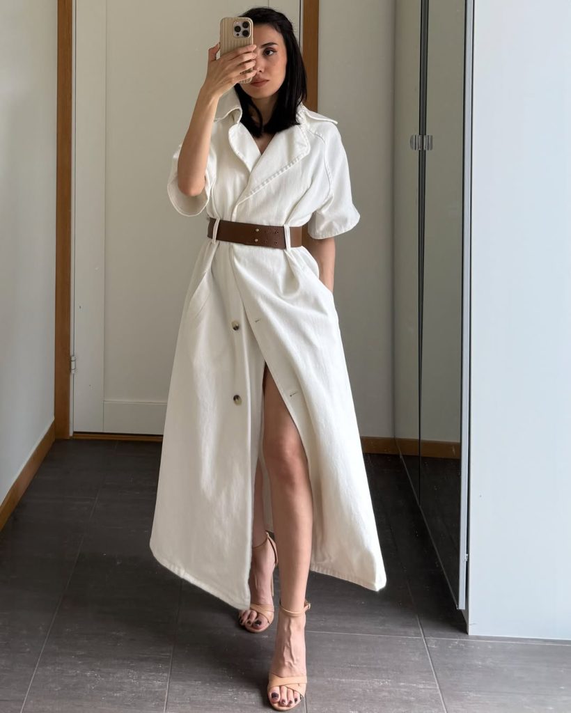 This outfit fits seamlessly into spring 2026 city life—ideal for daytime meetings, gallery visits, or relaxed dinners. The belted waist flatters mid-size proportions while keeping the look clean. Add personality with gold hoops or a soft leather clutch. Avoid heavy layers or oversized bags that interrupt the dress’s fluid line.