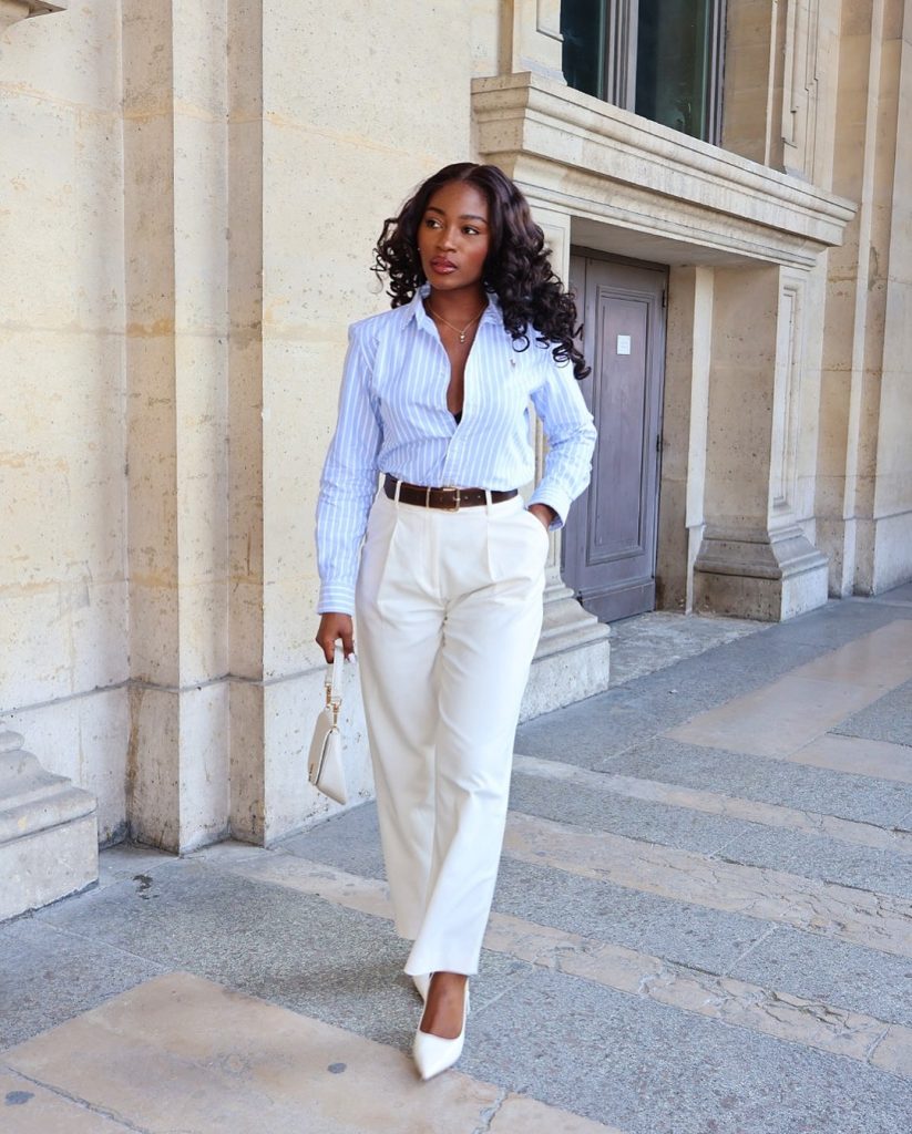 A crisp striped shirt paired with tailored trousers delivers a timeless French aesthetic rooted in balance and confidence.
