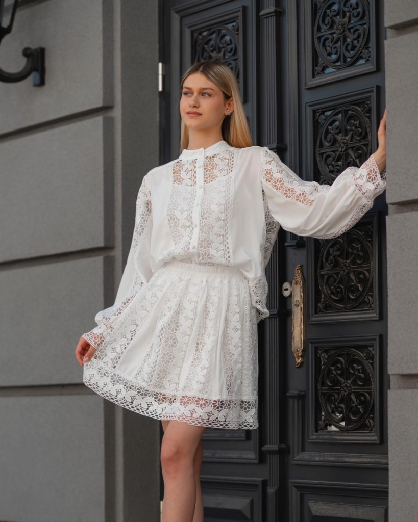 - White lace blouse, long sleeves with detail
