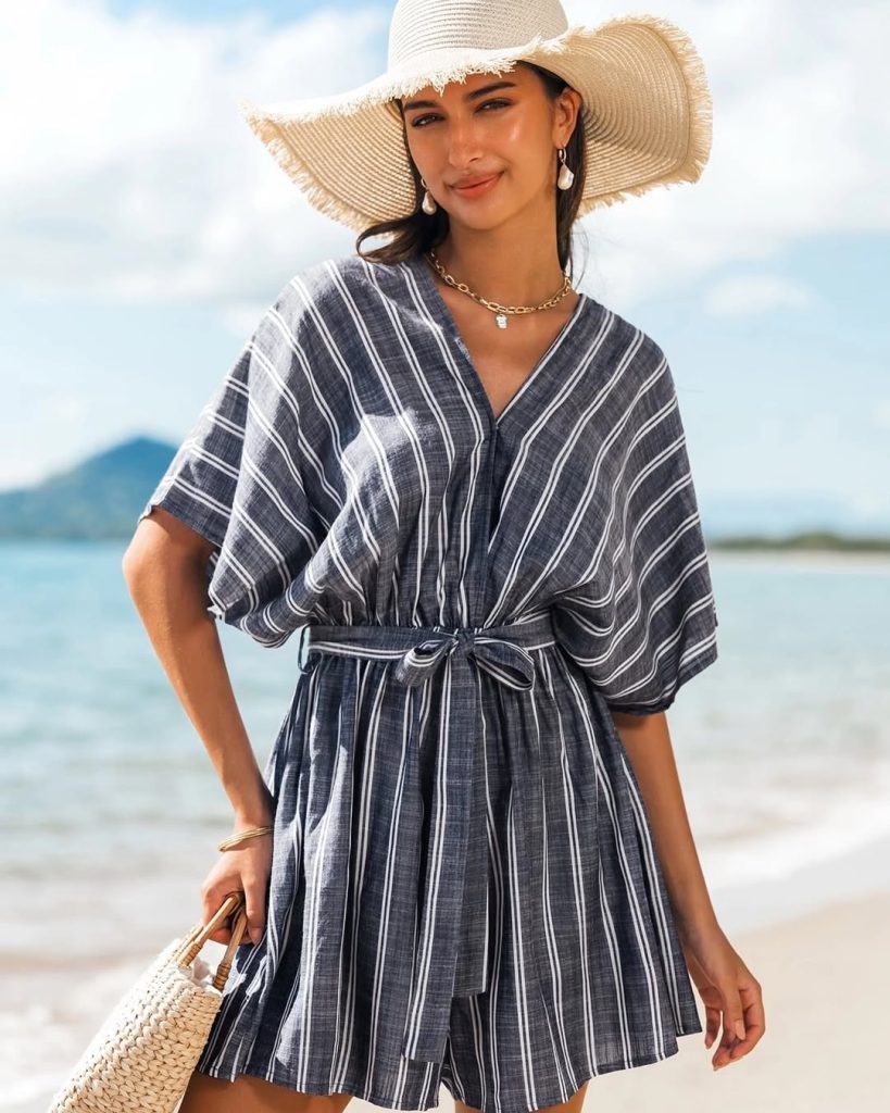 A breezy striped romper paired with sun-ready accessories delivers effortless Casual charm with a relaxed aesthetic—perfect for warm coastal days.