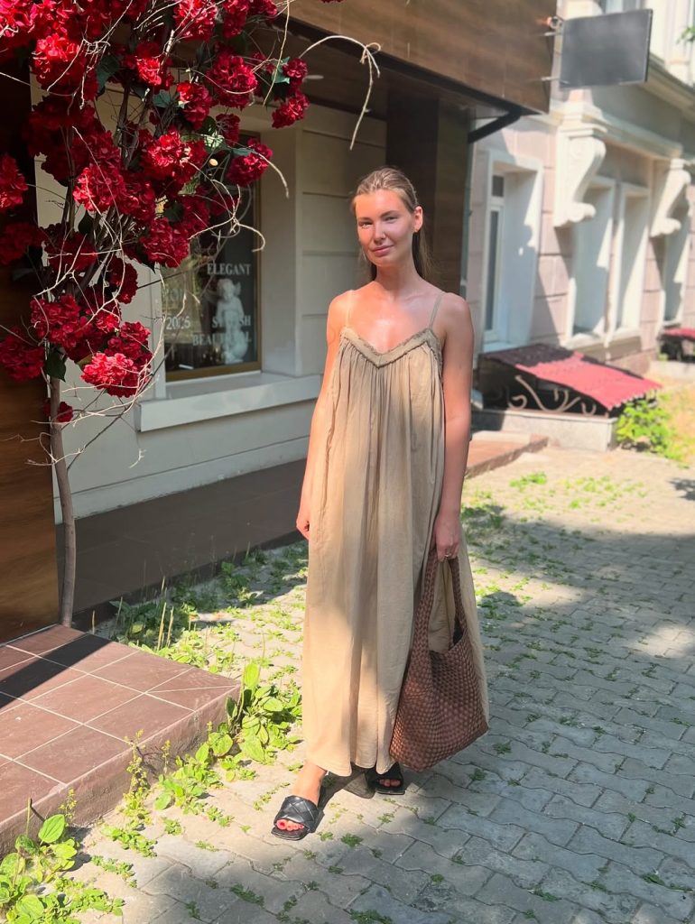 This look feels like an evening just before sunset—warm, calm, and a little romantic. I’d pair it with neutral sandals or even knee-high boots for a bold twist. Avoid heavy layering; the magic is in its movement and simplicity. Perfect for date nights, summer terraces, or moments when you want to feel effortlessly выразительно.