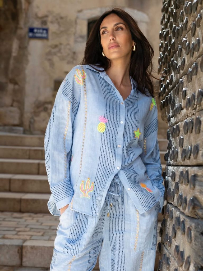What happens when comfort meets personality? A lightweight co-ord set with delicate embroidery answers that question with quiet confidence. This look feels like a postcard from somewhere sunlit and slow-paced, where style doesn’t try too hard—it simply exists.