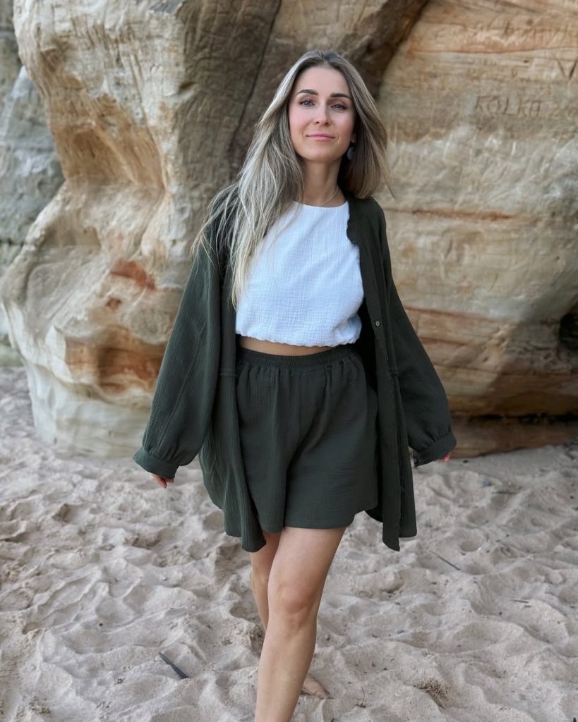 This outfit is all about movement and comfort. Add simple sandals or go barefoot for a true beach feel. A delicate necklace enhances the softness without overdoing it. Avoid structured pieces—this look thrives on ease. Perfect for seaside walks, vacation mornings, or spontaneous summer road trips.