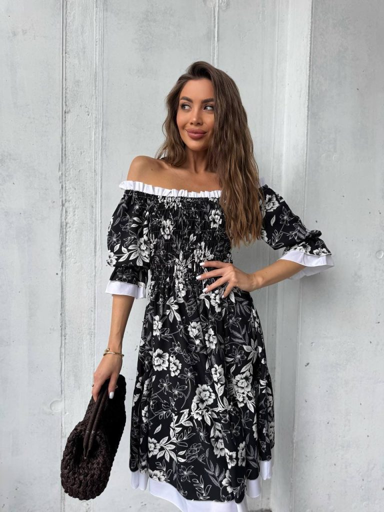 There’s a certain poetry in monochrome florals. This off-shoulder dress captures that balance between romance and structure, making it feel both classic and current.