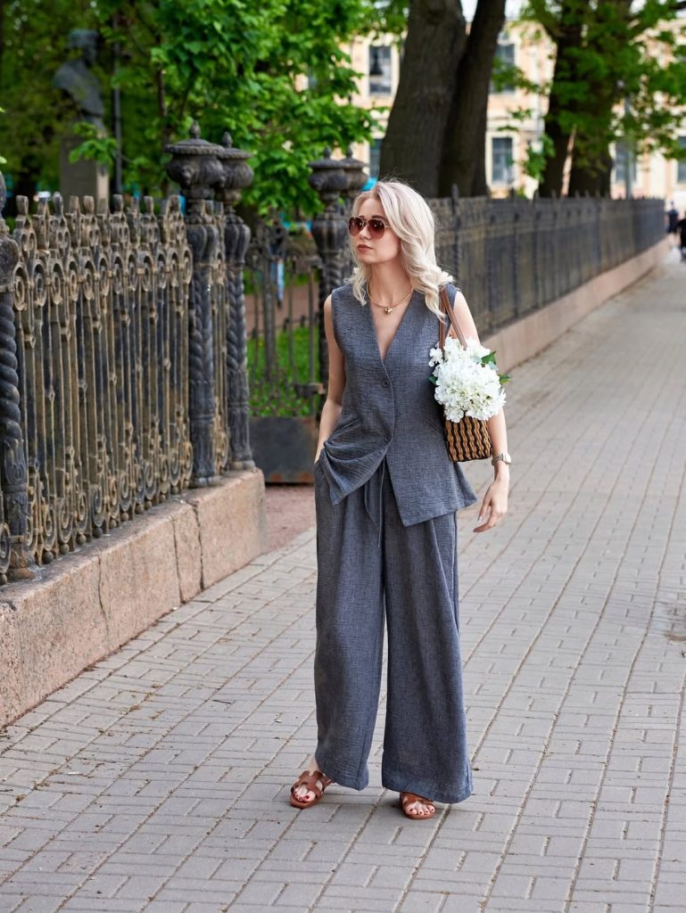 And then, a shift in mood—something quieter, more composed. This tailored set proves that summer style doesn’t always have to be bright to stand out.