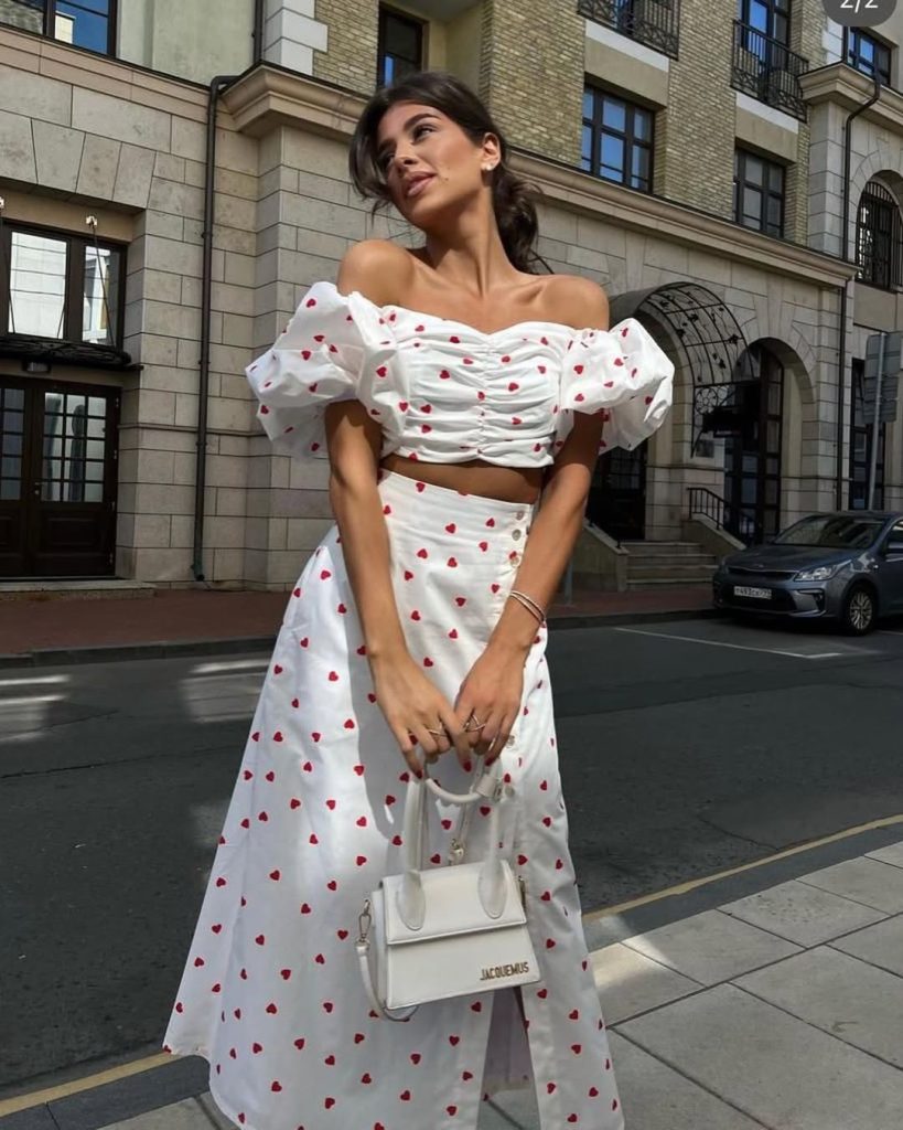 There’s a lighthearted energy here that’s difficult to ignore. It’s feminine without being overly delicate, thanks to the crisp structure of the set. I’d keep shoes minimal—strappy sandals or classic flats would work beautifully. Avoid adding bold prints; let the hearts tell the story.