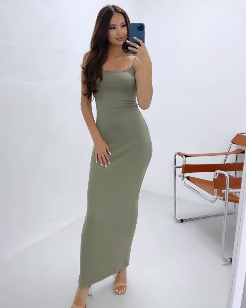 And then—something entirely different. A sleek olive bodycon dress that leans into clean lines and confident minimalism, proving that sometimes less truly is more.