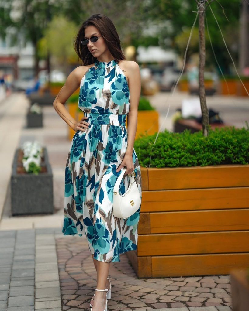 To enhance this look, consider adding a light cardigan or linen blazer for transitional moments. Avoid overly bold accessories—the print already tells the story. This look is a natural choice for garden parties, weekend brunches, or even summer weddings where you want to feel polished without trying too hard.