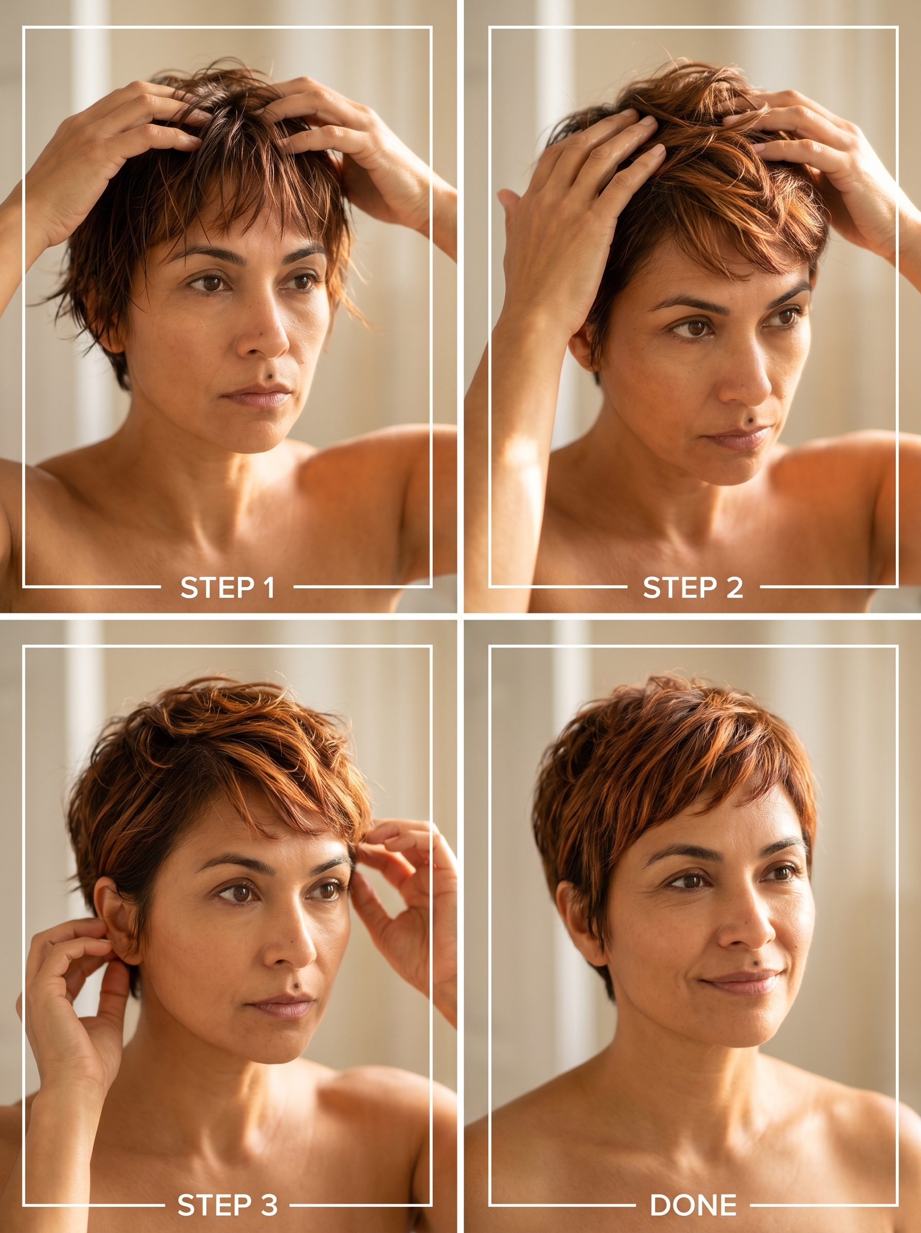 The Micro-Fringe Pixie with Solar-Flared Copper is an edgy, bold statement for summer hairstyles for short hair, featuring a vivid and reflective copper with golden highlights, as demonstrated in the photo series showing a woman styling her short, choppy copper hair from damp to defined. This look requires dedicated salon visits every 3-5 weeks to maintain the vibrant copper color, along with an at-home protective hair veil to shield from sun, salt, and chlorine, paired with a sea salt spray priced at $30 to enhance texture and achieve heatless beach waves in short hair.