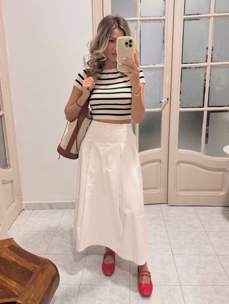 A striped knit top with a flowing skirt channels effortless, chic, classy European work style.