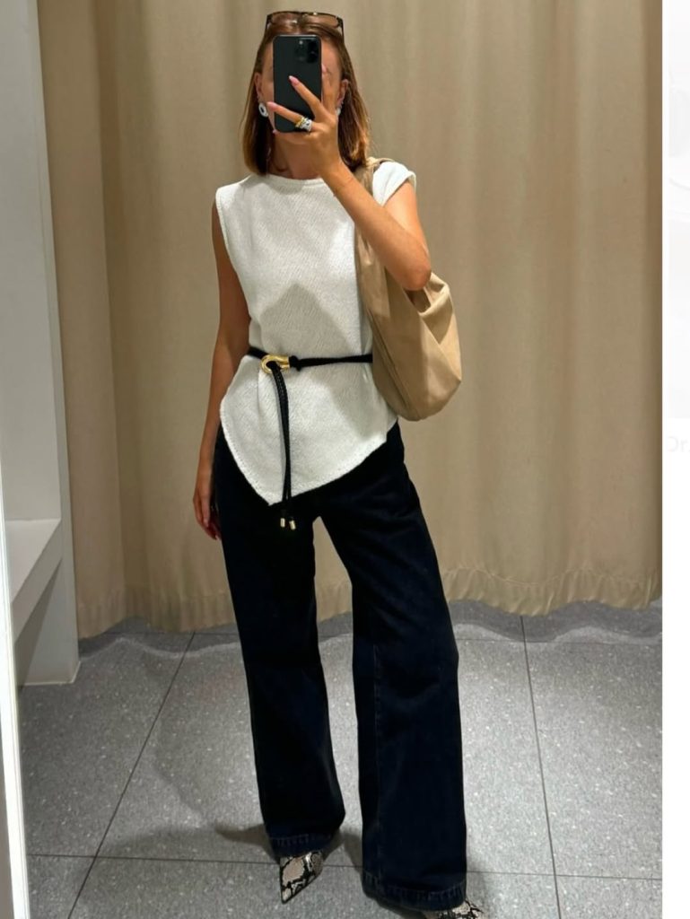 This outfit is a great example of how a woman can elevate everyday basics to something truly chic. The belt adds shape and intention, especially flattering for women’s curvy and midsize silhouettes. For office settings, consider swapping denim for tailored trousers if needed. Avoid overly casual footwear—heels or sleek flats keep it professional. Ideal for hybrid workdays or casual meetings where style still matters.