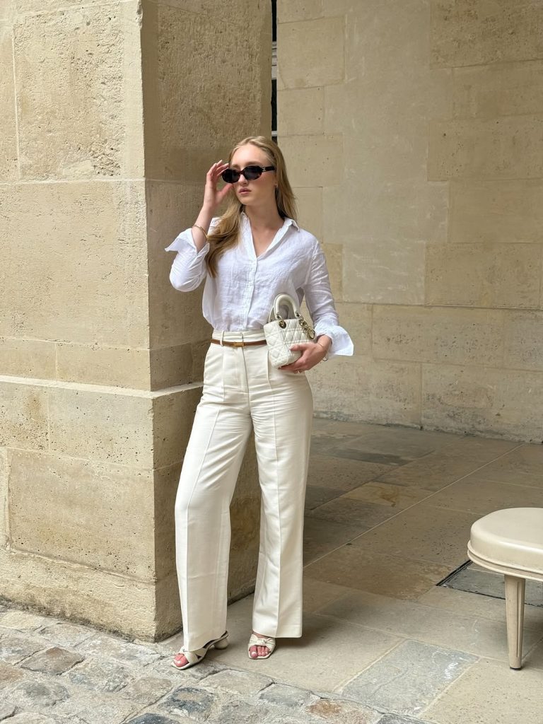 Few outfits feel as fresh in summer office outfits in 2026 as a head-to-toe white look. It’s crisp, commanding, and ideal for professional settings. Especially flattering for petite women, the vertical lines elongate the frame beautifully. Add gold jewelry or a silk scarf for dimension. Avoid dark, heavy layers that break the harmony. Ideal for important meetings, presentations, or days when you want to feel especially put-together.