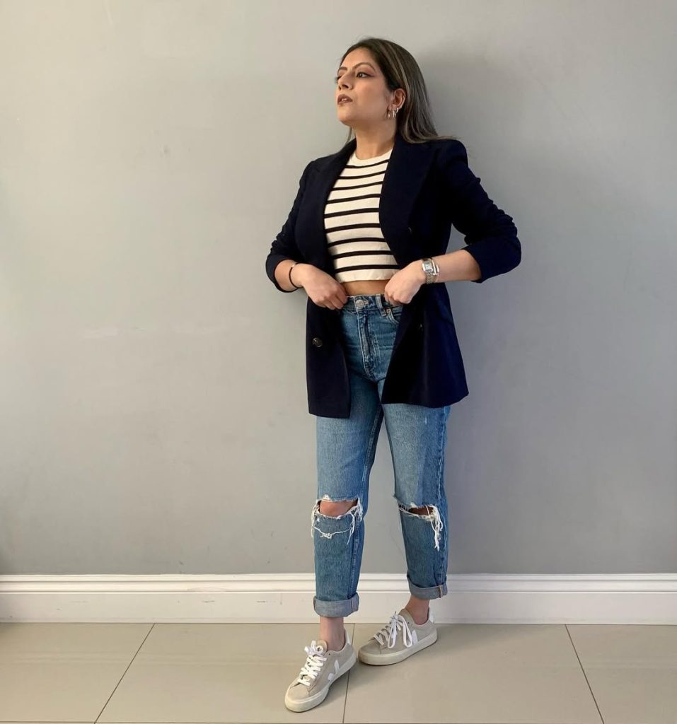 A blazer paired with denim strikes the perfect work-chic smart-casual balance.