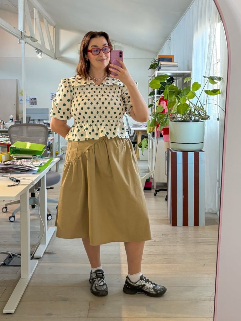 This outfit is a beautiful reminder that office style can still feel joyful. It leans into Aesthetic dressing while remaining practical for long workdays. Great for curvy women, as the silhouette defines the waist and allows movement. Add a structured bag or swap sneakers for ballet flats to elevate your look. Avoid overly busy prints—let one piece shine. Ideal for creative spaces, casual offices, or days when you want your outfit to lift your mood.